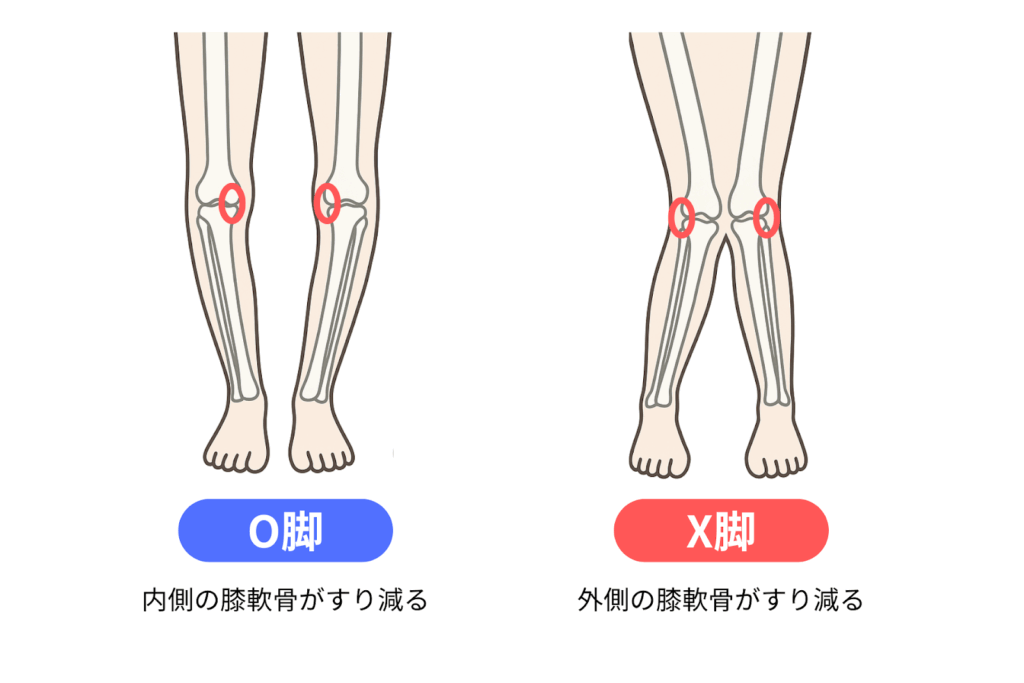 変形性膝関節症は、進行するとともに関節の可動域が狭くなり、O脚(内反膝)や歩行障害が目立つようになります。
